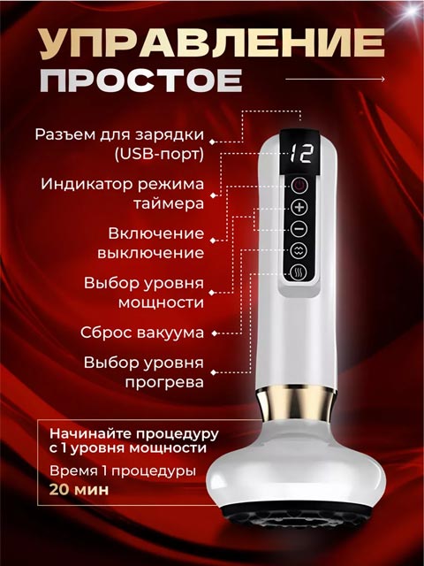 Массажер имеет двенадцать режимов нагрева, двенадцать скоростей вакуума. Мы рекомендуем начинать процедуру массажа с первого уровня всасывания и по мере привыкания увеличивая мощность.