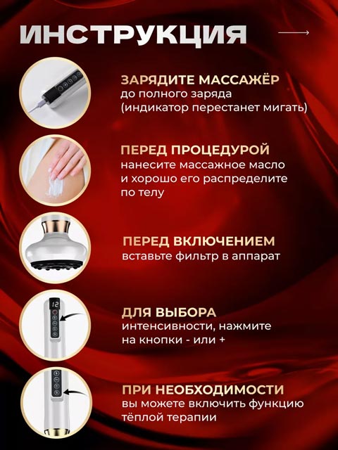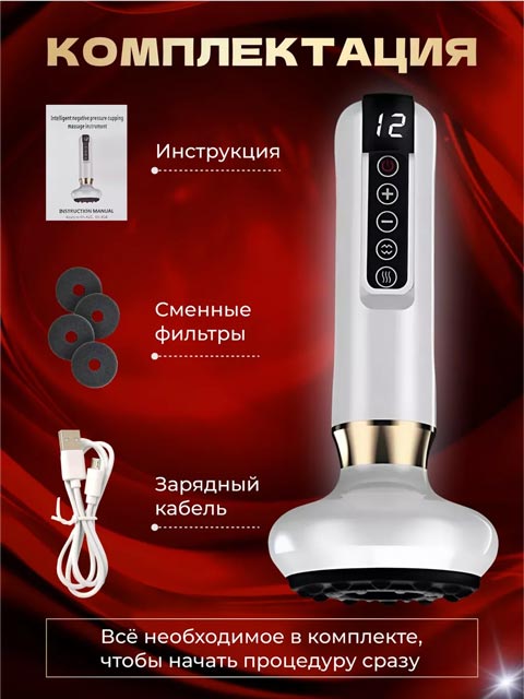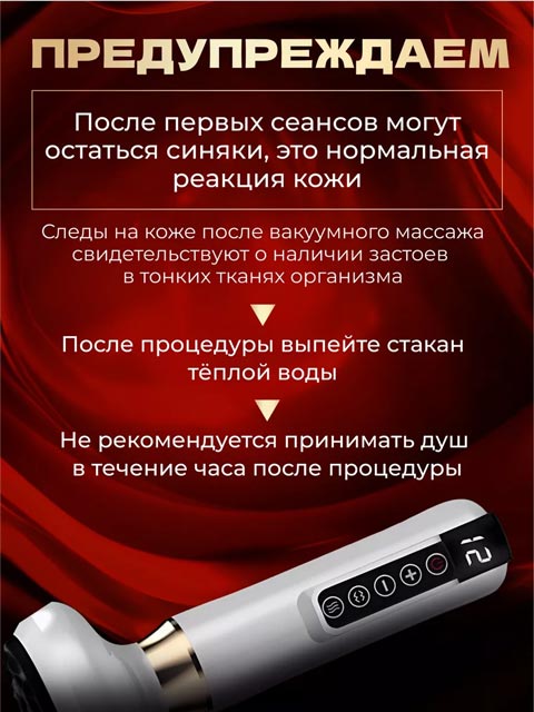 Массажер имеет двенадцать режимов нагрева, двенадцать скоростей вакуума. Мы рекомендуем начинать процедуру массажа с первого уровня всасывания и по мере привыкания увеличивая мощность.